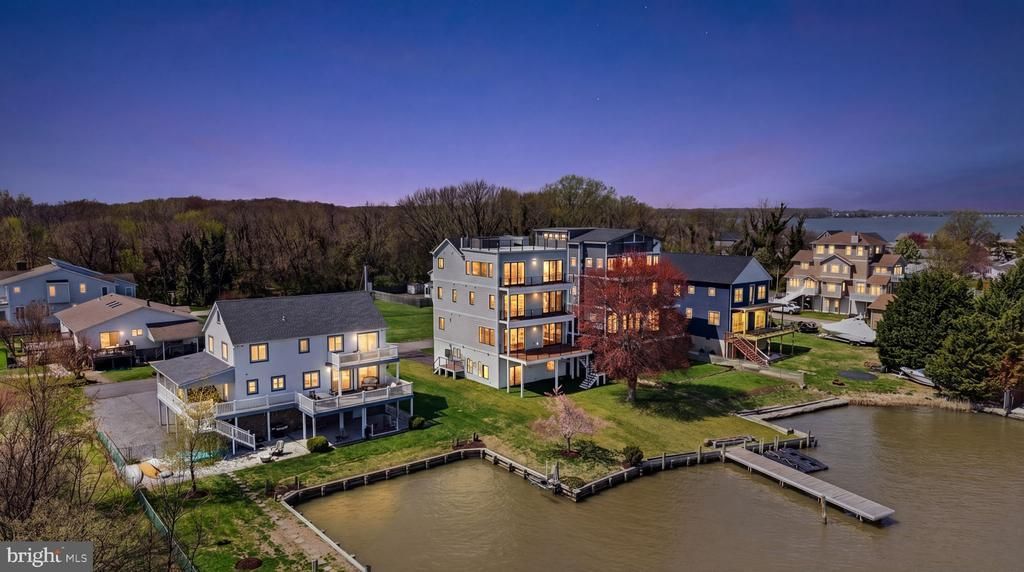 Introducing an extraordinary ultra-luxury waterfront new construction on Miller’s Island, where cutting-edge design meets effortless coastal living. Spanning over 4,000 square feet across four impeccably finished levels, this one-of-a-kind residence offers 4 bedrooms, 3.5 baths, elevator and panoramic views of the Chesapeake Bay from nearly every vantage point. Built with uncompromising quality and innovation, the home features 600-amp electrical service, dual-zone HVAC with high-efficiency inverter condensers, whole-house humidification, and full spray foam insulation for superior comfort and energy performance. Striking architectural elements include 11-foot ceilings, 9-foot doors, and premium Marvin Windows that flood the home with natural light, all wrapped in durable Hardie Plank siding. At the heart of the home, a designer chef’s kitchen showcases custom cabinetry, a statement hood, a 36-inch induction cooktop, commercial-grade stainless steel appliances, speed oven, and an oversized quartz island with dramatic full-height quartz walls—perfect for entertaining at scale. Open floor plan on main level with wet bar and 76” Modern Flames fireplace. Dual sets of 3 panel sliders open to rear tree deck with cable rails for unbelievable views. Curated for both relaxation and entertainment, the residence includes a private in-home theater experience in the primary suite featuring a projection system with Dolby 5.1 surround sound, along with pre-wired audio throughout. The primary suite is a true retreat, offering a custom accent wall with sconces, retractable projection screen, dual walk-in closets, and a spa-inspired bath with radiant heated floors, frameless glass shower, bidet, and refined designer finishes. The upper levels continue to impress with spacious secondary bedrooms, a beautifully appointed en-suite, and a convenient laundry room. A top-floor loft with wet bar seamlessly opens to a private deck, creating an ideal indoor-outdoor entertaining space. The crown jewel: an expansive rooftop deck complete with Duradek and hot tub, delivering breathtaking 360-degree water views—an unrivaled setting for sunset gatherings over the bay. Additional luxury amenities include EV charging station in 1 car garage, finished lower walk out level, freshly sodded yard, new pier with floating jet ski/kayak dock, integrated security system, whole house generator pre-wired, and smart-home readiness throughout. A rare opportunity to own a true waterfront masterpiece where modern luxury, technology, and coastal elegance converge.