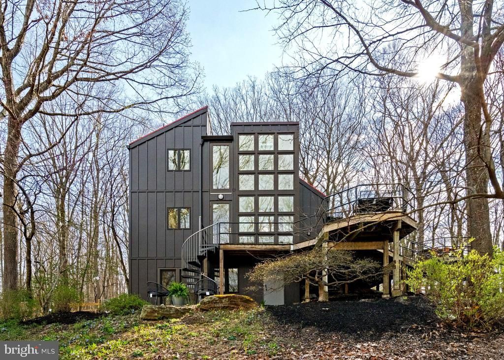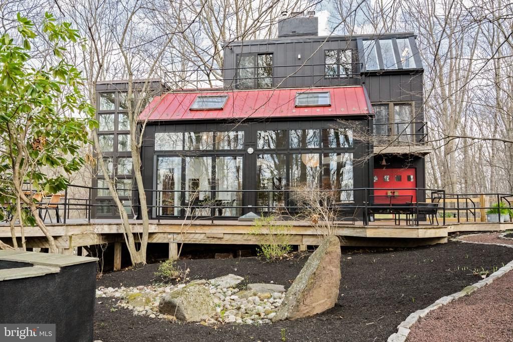 Breathtaking architecture on three wooded acres provides a residence as equally well-suited for entertaining as it is for tranquil everyday living in this Bucks County treasure. The Scandinavian influence is evident in the full walls of glass and dramatic windows that bring the outside in, a central chimney that provides a fireplace on every floor, and the use of natural materials including slate and oak floors. Lovely custom details with a touch of whimsy grace the interior, and the current owners have made extensive improvements. The main floor offers a spacious foyer entrance, library with skylight, powder room and sitting room all on one side of a double fireplace with newly installed woodstove insert. On the other side is the showstopping open living and dining space with vaulted ceilings, floor-to-ceiling windows, custom conversation pit with integrated storage that seats a crowd, and a just-installed wall of custom 12-foot glass bifold doors that allow the separation between the inside and the expansive Ipe wood deck with multiple entertaining areas to all but disappear. The corner breakfast room has two walls of floor-to-double-story-ceiling windows, from which the current owners eliminated a wall and added a breakfast bar to make it more open to the kitchen, where the Scandinavian design principles really come to life. Functional details like a prep sink, pot filler and wine fridge are integrated into the understated warmth and luxury of oak flat-front cabinets alongside fresh quartz countertops and glazed ceramic tile backsplash. The second story has a large central sitting room with fireplace overlooking the living room with a newly renovated terrazzo tile bathroom, two bedrooms, and an office with French doors to a balcony. The third floor is the peaceful primary suite, with a fireplace and sliders to a balcony that spans the entire side of the house and overlooks the wooded hillside and pool area. Soak among the treetops in the gorgeously remodeled en suite, where the tub sits beneath a span of oversized sloped windows, or enjoy the same view from the curbless shower with fluted marble surround. The delightful walkout lower level has a wet bar, a large den with oversized French doors to a cobblestone patio, a guest suite with a newly renovated bathroom, and access to the laundry room. Just as stunning as the home itself is the newly plastered pool and spa with flagstone pavers, which are framed by a decorative wall on one side and an expanse of woods on the other. Other exterior upgrades include new elegant black Hardie board and batten siding and a fence encompassing a large area of the yard and pool. In a bucolic Bucks County setting and down a private road, the home is away-from-it-all yet a short drive to Doylestown, New Hope, and Lambertville, making it both a desirable year-round residence and an attractive getaway for Philadelphians and New Yorkers alike.